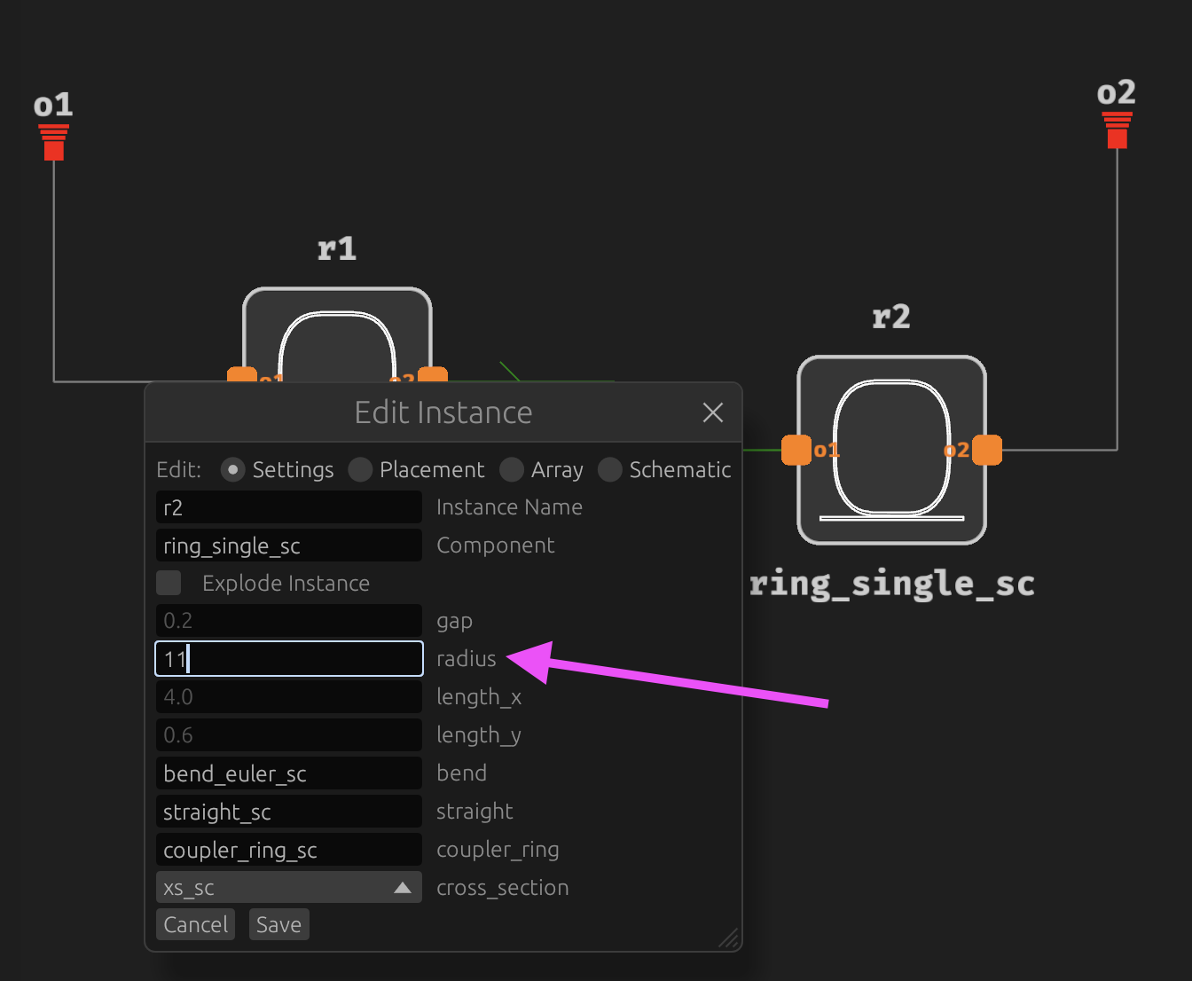 In the Schematic View tab, right click on r2 and select edit. Set the radius of r2 to 11 um, then press enter.