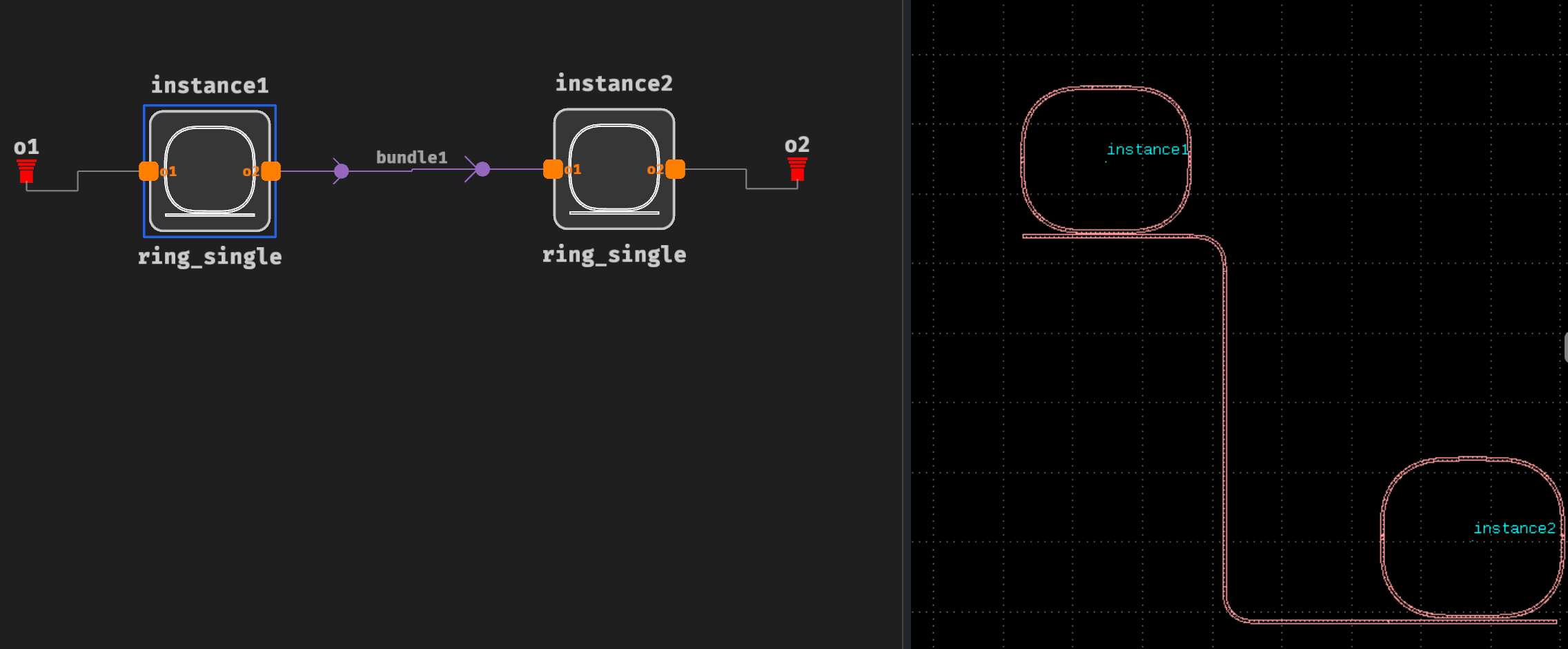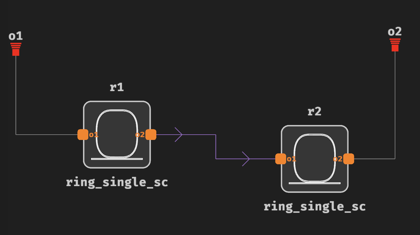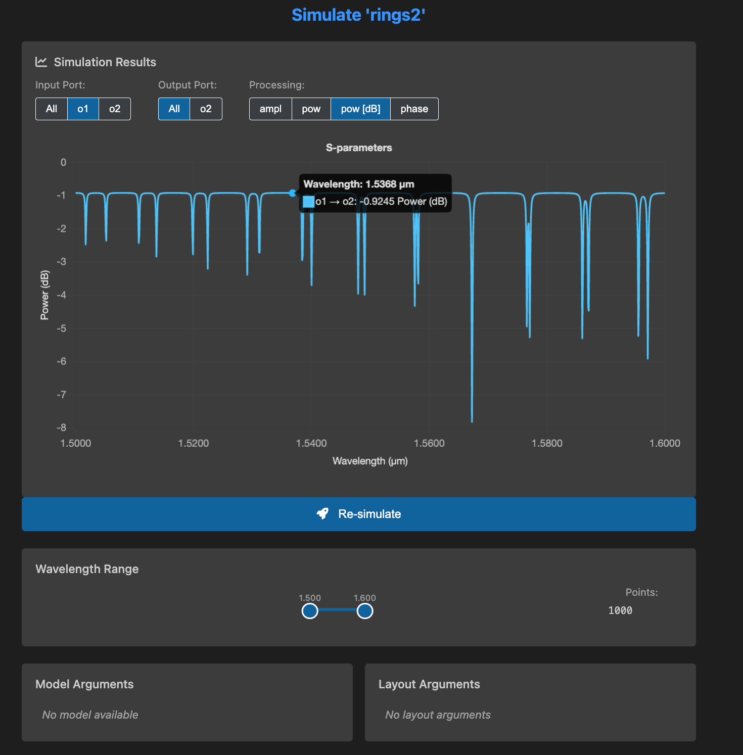 Run the simulation again by clicking the graph icon and selecting Simulate & Plot > From Layout. See how both ring resonances only filter one wavelength now at 1565 nm.